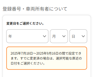先日、車両所有者が変わったため変更の手続きをしていたが、変更日に過去日付を選択できず、いつに設定すればいいかわからなかった。