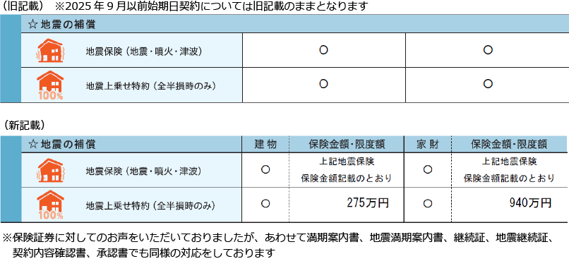 2025年10月以降の始期日契約に保険つきましては、保険証券に地震上乗せ特約の保険金額を記載しました。