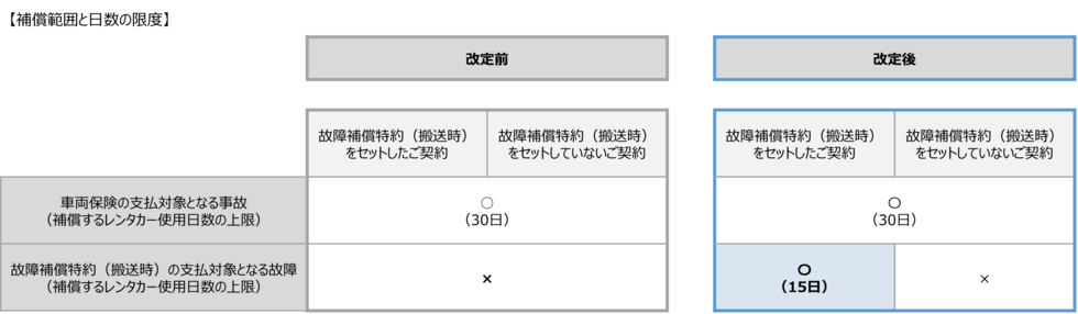 「故障補償特約(搬送時)」と「事故時レンタカー費用特約」の両方をセットしてご契約いただいている場合は、「故障補償特約(搬送時)」の支払対象となる故障損害に伴い借り入れたレンタカー費用を「事故時レンタカー費用特約」で補償できるように改定しました。
