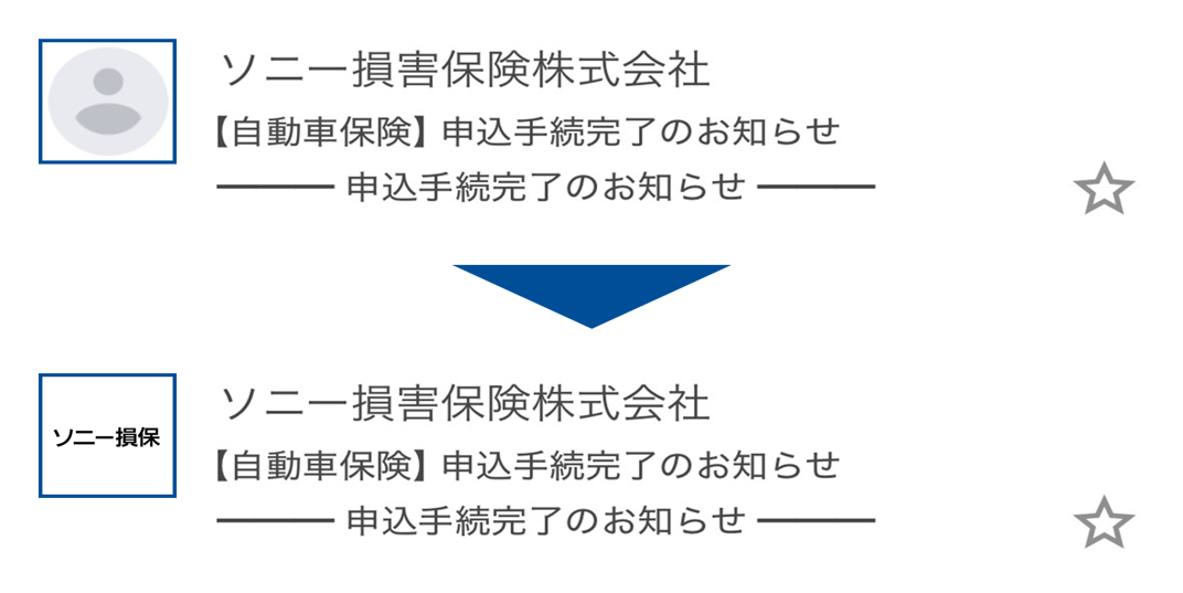 メール一覧画面にソニー損保のロゴが表示されます。(上:BIMI導入前、下:BIMI導入後)